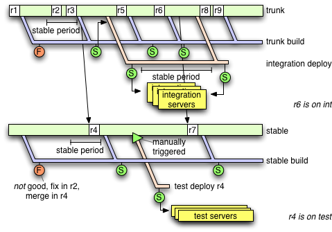 Every commit on trunk may trigger a trunk build. The trunk build has a stable period of just a few minutes. Every successful trunk build may trigger an integration deploy. The integration deploy has a longer stable period, about an hour or two. It is also frequently triggered manually when an integration deploy failed or deployed broken software.
