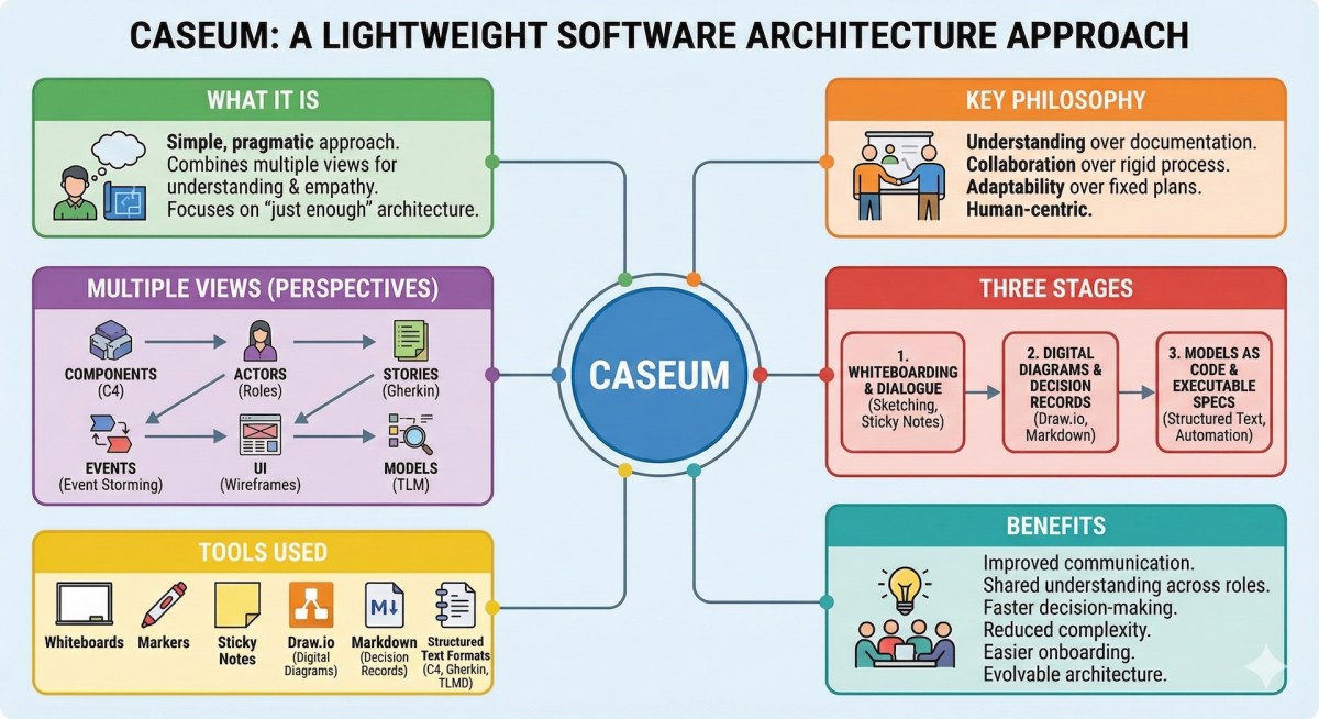Described my software architecture approach at https://lsimons.github.io/caseum/. Just common best practices and whiteboards. Hope a simple approach in simple English can be inspiring.