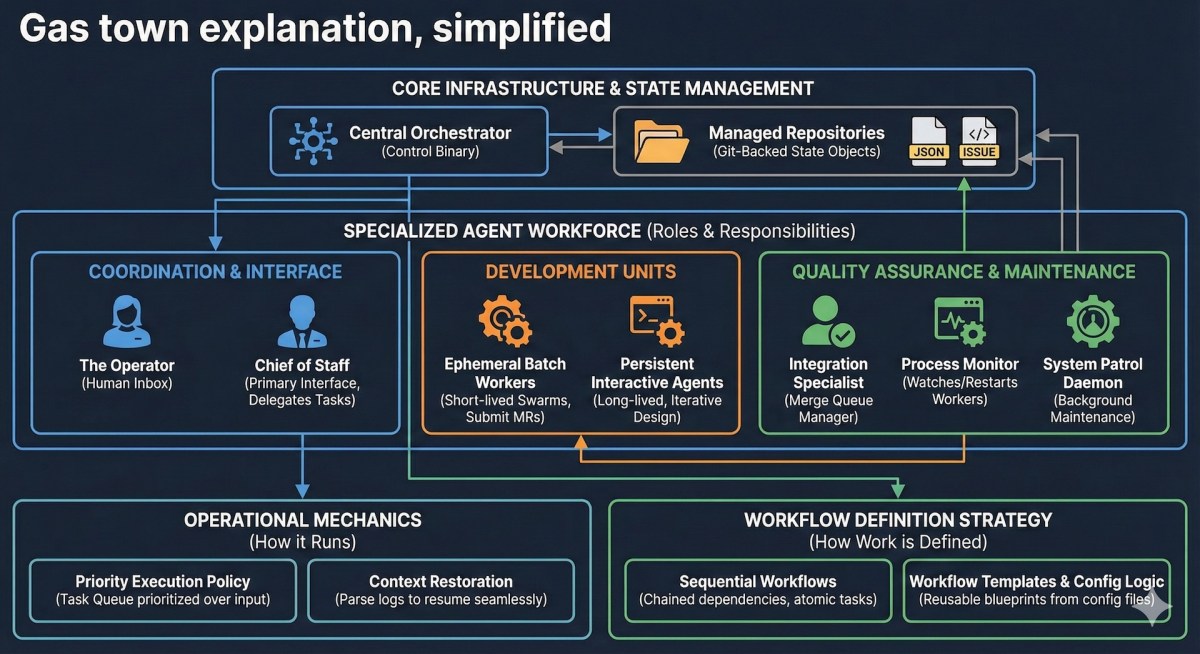 Yegge’s system manages the chaos of running 20–30 concurrent AI agents in parallel in YOLO mode. Key parts:
